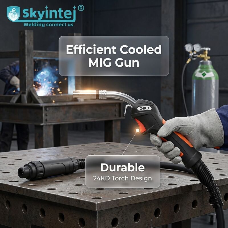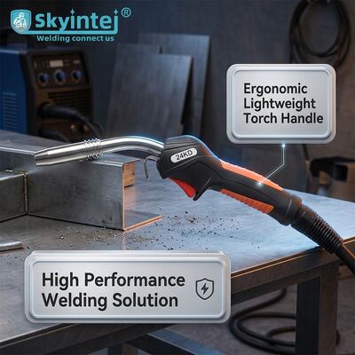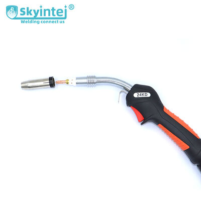 The 24KD MIG welding torch features quick-change consumables that significantly reduce maintenance time and downtime. This Metal Inert Gas welding torch delivers efficient, stable performance for industrial manufacturing, automotive maintenance, and metal fabrication applications.